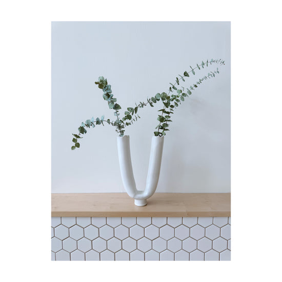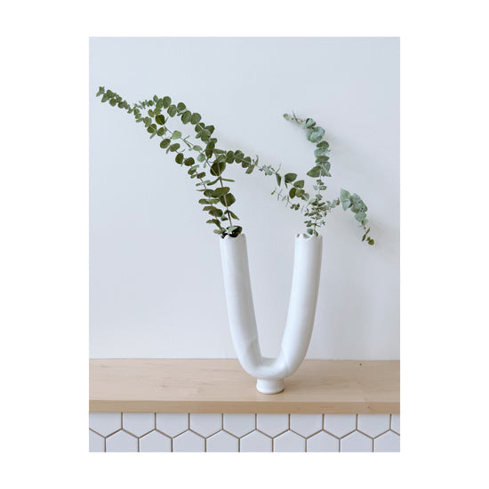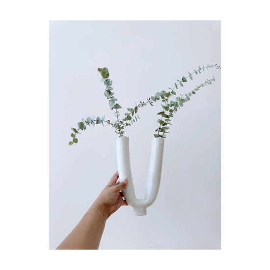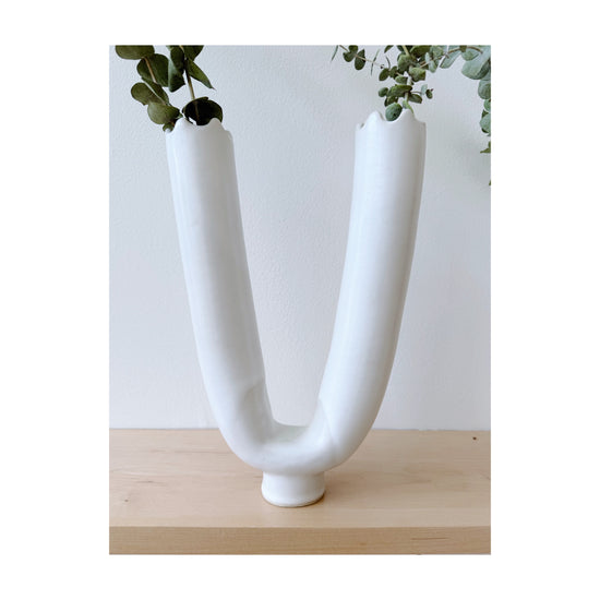 Hand sculpted vessel in white clay and finished in a soft satin glaze. It is both vase and sculpture, inviting fresh blooms, dried stems, or the quiet beauty of standing alone.
