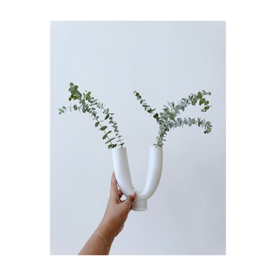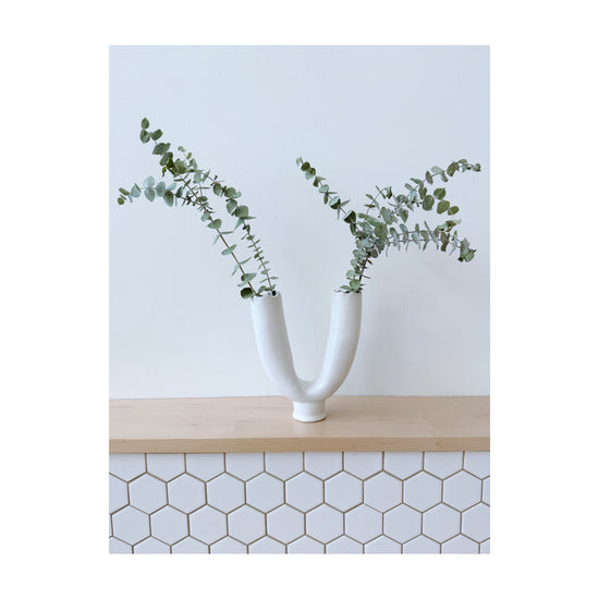 Hand sculpted vessel in white clay and finished in a soft satin glaze. It is both vase and sculpture, inviting fresh blooms, dried stems, or the quiet beauty of standing alone.