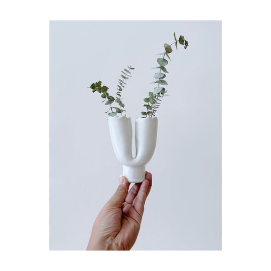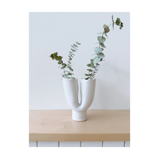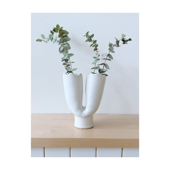Hand sculpted vessel in white clay and finished in a soft satin glaze. It is both vase and sculpture, inviting fresh blooms, dried stems, or the quiet beauty of standing alone.