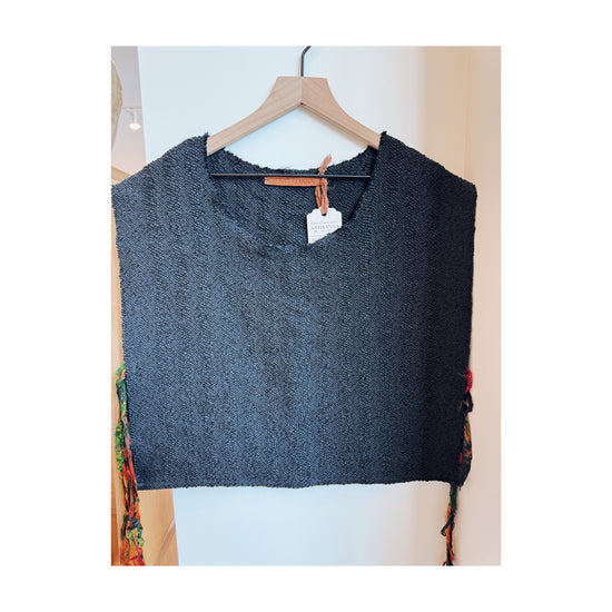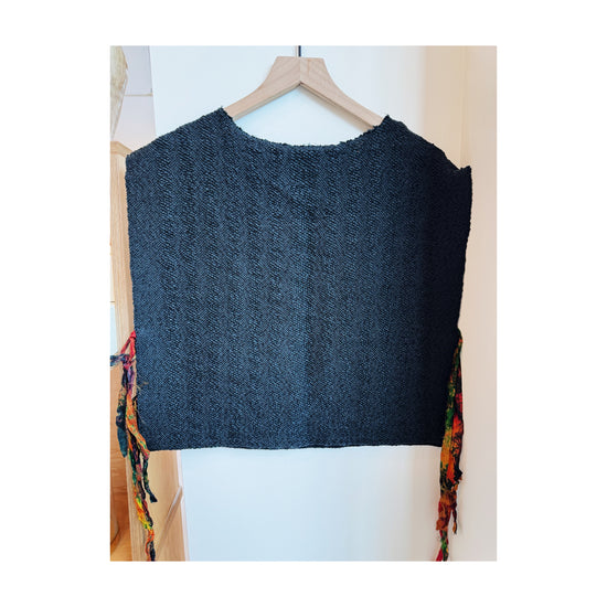 Unlike traditional layers, this piece features recycled sari silk ties in place of fixed seams, offering an open adjustable fit that flatters many bodies and moods. This particular piece features recycled sari silk ties on each side, sourced from a women's collective in India.