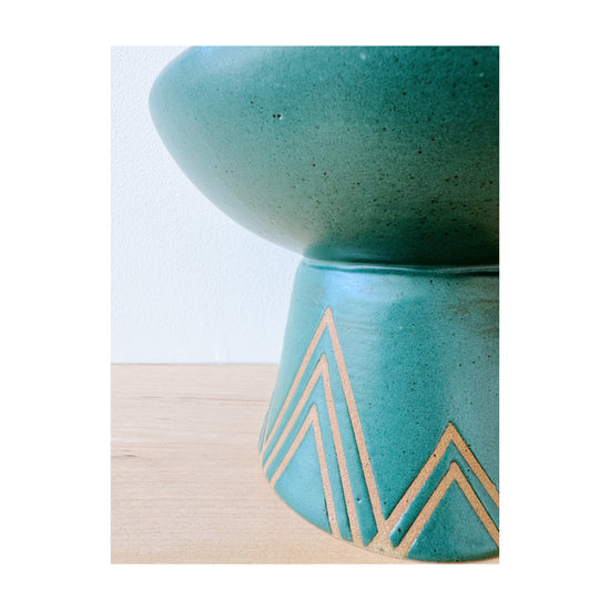 The Gather pieces are thrown on the wheel and designed with an edge. The surface resists the glaze in pure art deco fashion, revealing warm tones of bare clay beneath. A serving bowl and a pedestal fruit bowl offer balance and ceremony for everyday meals or special occasions.