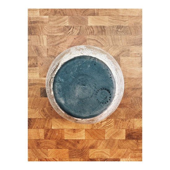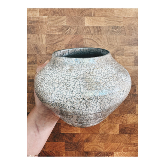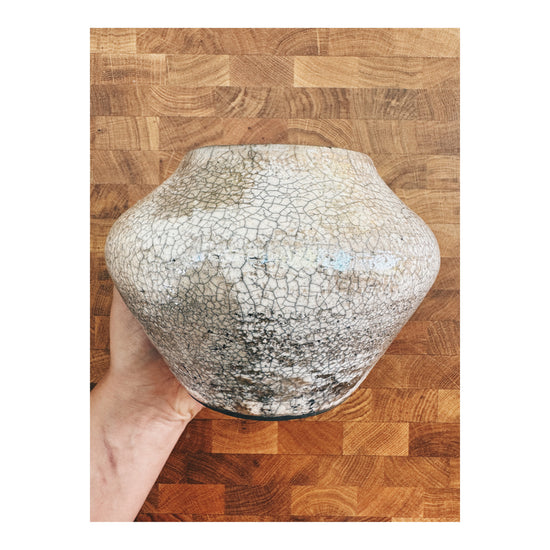 A bold yet delicate vessel shaped by hand and touched by the quiet magic of white crackle raku. Emerging glowing from the kiln, a series of breaths meet its surface, creating a sudden thermal shock that both weaves delicate cracks and breathes life into the vessel in a dance of fire and air.