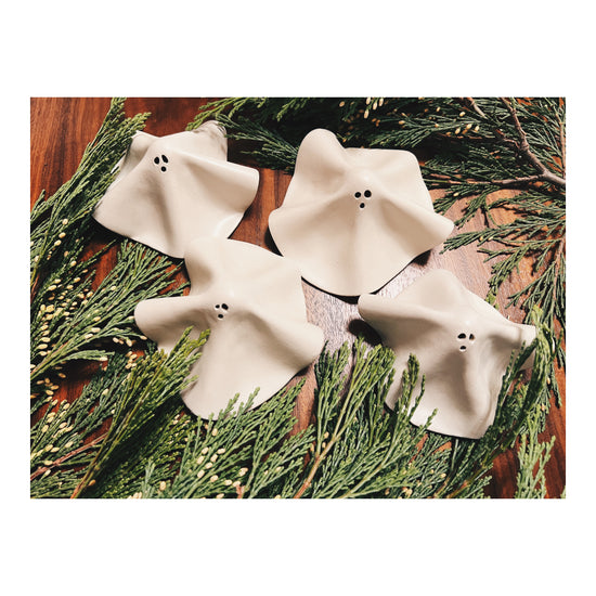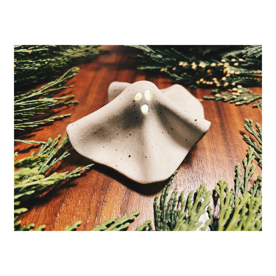 All ghosties are made by hand, and naturally vary in size, shape, facial expression, and even clay body, making each one entirely unique! With this batch, you'll receive a battery tea light and tiny green or red beanie for your spooky friend.