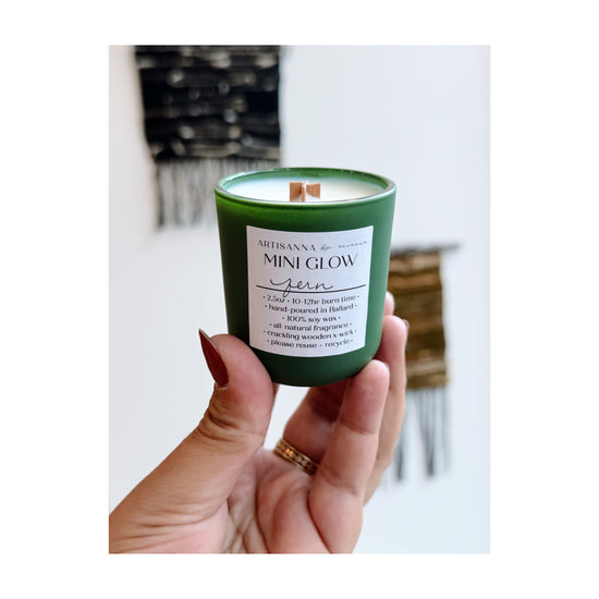 Part of the GLOW Collection, each candle is hand-poured in small batches in Ballard, Seattle, using 100% pure soy wax, clean-burning natural fragrances, and a wooden X wick that naturally crackles as it burns. These candles are poured into mini glass vessels that can be reused around the home or responsibly recycled.