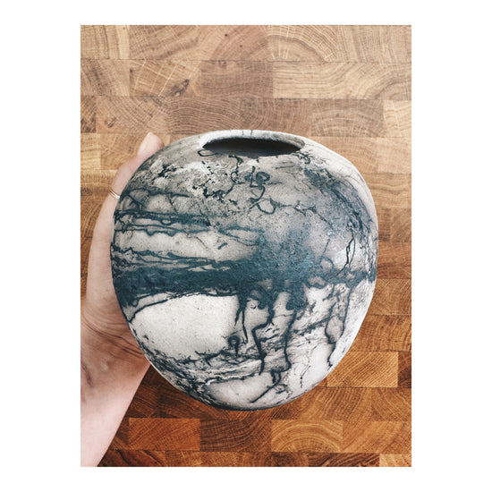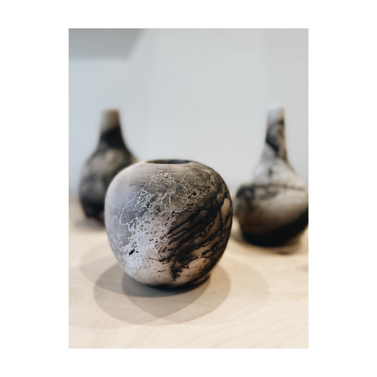 A study in smoke and stillness, this moon jar is shaped by hand and finished in the wild spirit and ancient art of horsehair raku. As the vessel emerges red hot from the kiln, strands of horsehair are laid onto its glowing surface — where they curl, scorch, and leave behind wisps of carbon, like ink drawn in flame.